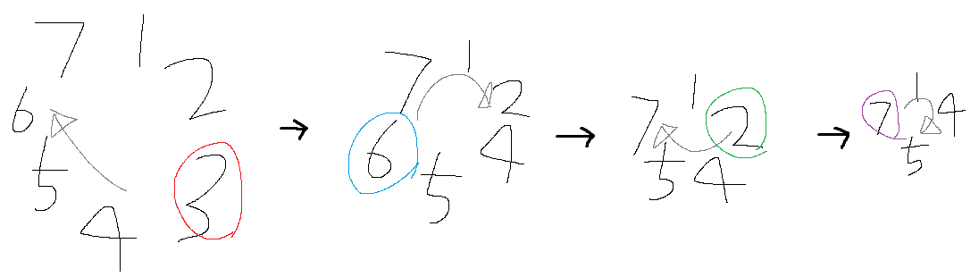 > 요세푸스 순열이란 걸 첨 들어봐서 이해하기 위해서 그림을 그렸습니다. 어떻게 K번째 사람을 제거하는데 3다음 6이지? 했다가(3이 나가면 [1, 2, 4, 5, 6, 7]일 텐데 여기서 3번째 원소는 4가 아닌가?) 그림을 그려보고 나서야 그 순서가 '제거된 사람 기준'인 걸 깨달았어요.
