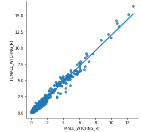 1에 놀라우리만치 가까운 값이 도출되었다. 이로써 우리는 남성의 시청률과 여성의 시청률은 선형관계를 가지며 상관관계 또한 매우 큼을 확인했다!