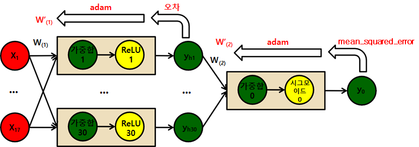 - 왼쪽 그림은 위 코드의 실행과정을 설명한 것. 첫번째로 쌓은 은닉층의 활성함수가 relu -> relu를 적용한 결과가 이후의 은닉층에 들어감 -> sigmoid 활성함수를 출력으로 갖게 됨