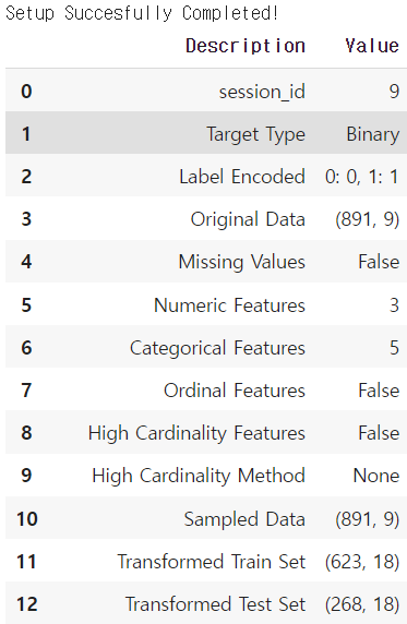 - setup을 사용하면 알아서 train/test split, 간단한 전처리 등이 수행된다.! 이는 이후 모델생성 등에 train/test등을 쓰지 않아도 알아서 적용된다! 너무너무 신기..