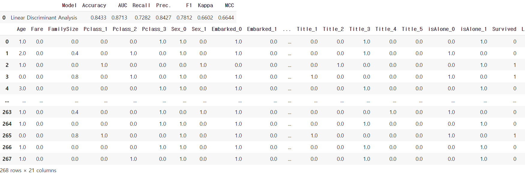 #Survived가 실제 y값, label이 예측값, score는 모델이 (예측)값에 대해 확신하는 정도