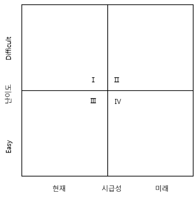 - 과제 우선순위 선정: 3사분면을 최우선으로 분석과제 적용, 시급성 순으로 치면 3->4->2, 난이도 순으로 치면 3->1->2